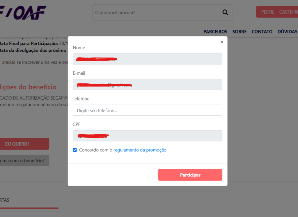 Em todas as promoções você vai encontrar o botão “Problema com o benefício?”. Ao clicar nele, você será direcionado para um formulário. Preencha corretamente e nossa equipe vai ajudá-lo na sua dúvida.